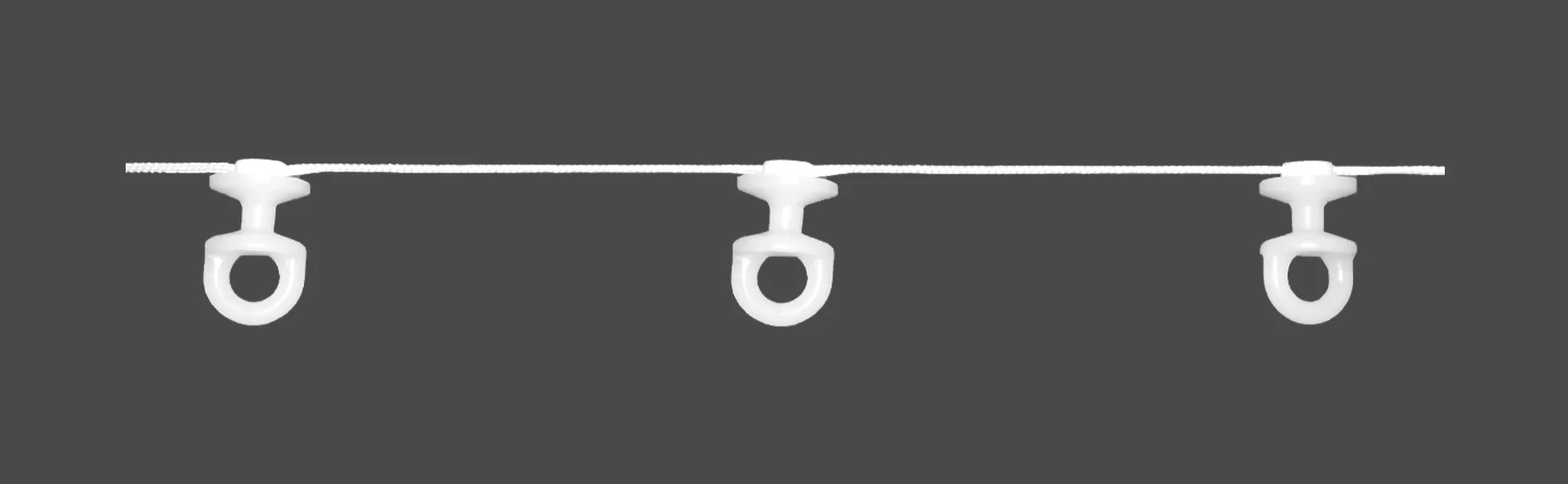 Kasutatakse kardinate süsteemseks paigalduseks, fikseeritud voldi saamiseks. Liugurid on kinnitatud nöörile 6 cm tagant.