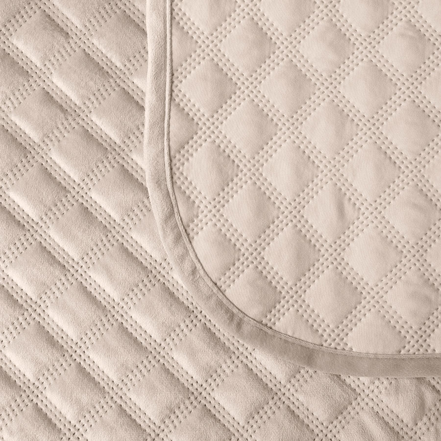 Dekoratiivne tepitud voodikate, geomeetrilise mustriga, valmistatud kuumpressimise tehnikas.