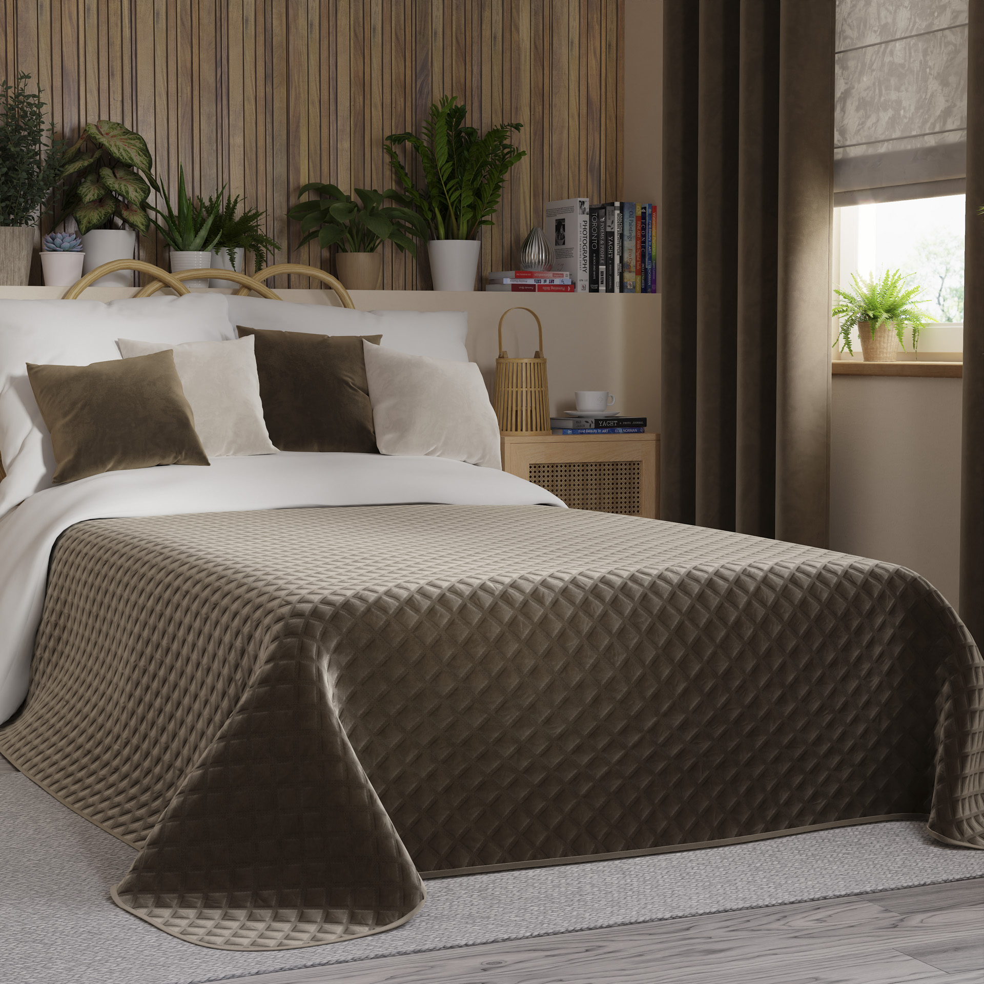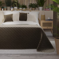 Dekoratiivne tepitud voodikate, geomeetrilise mustriga, valmistatud kuumpressimise tehnikas.