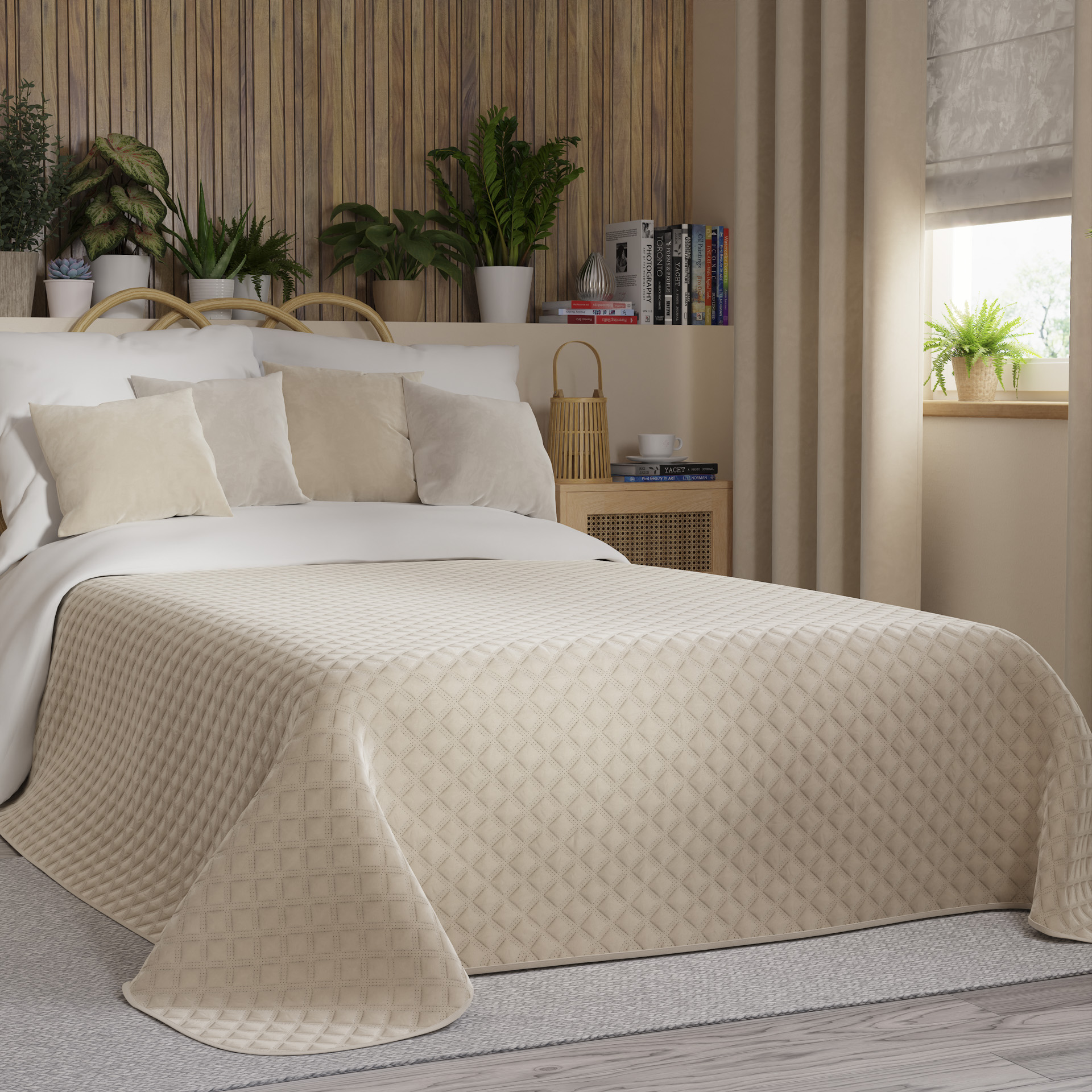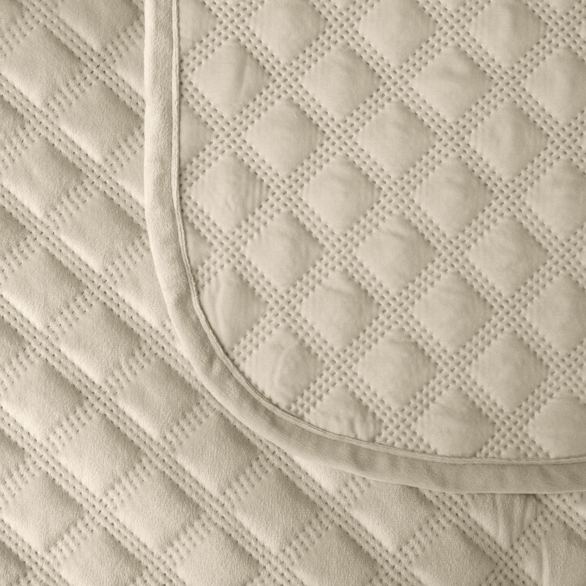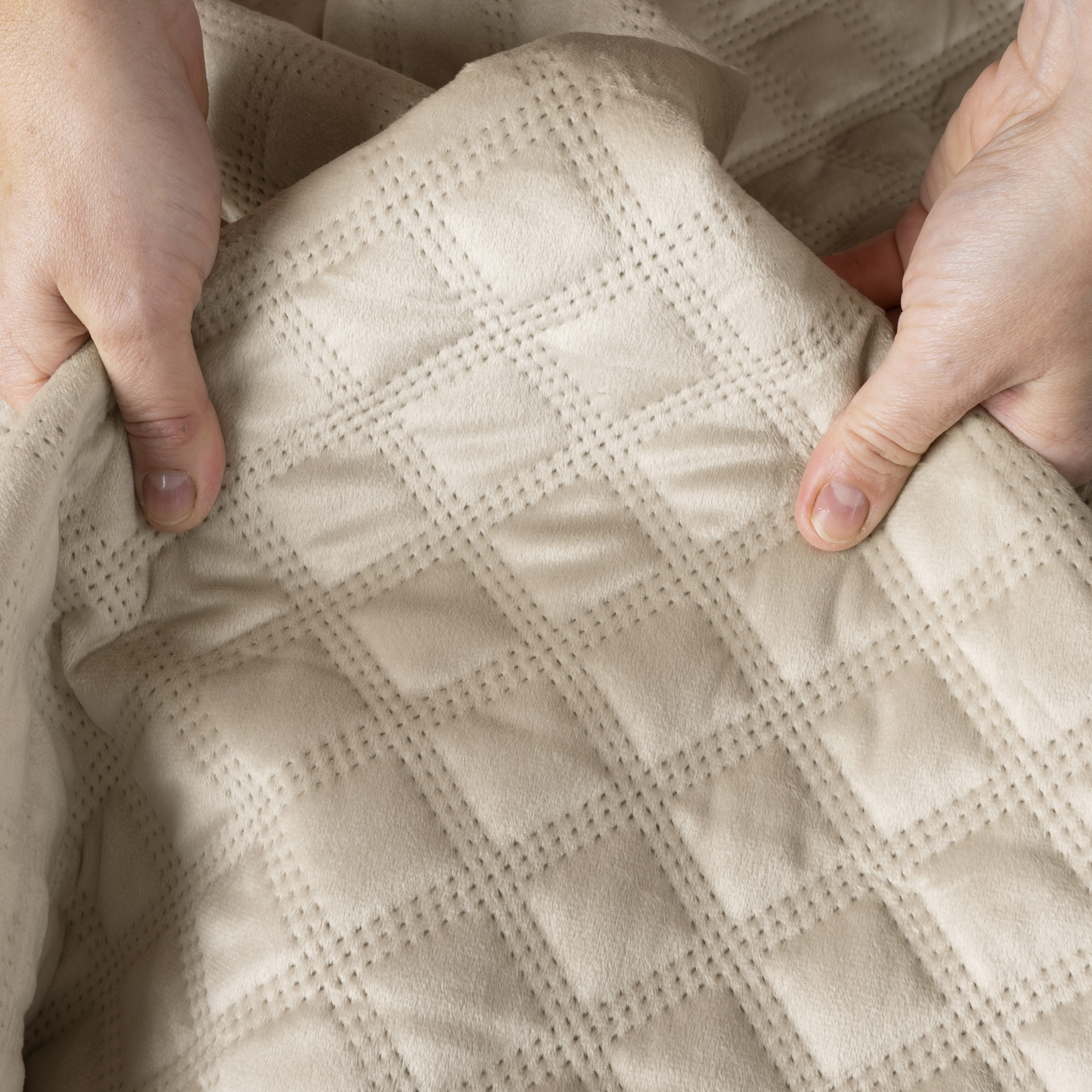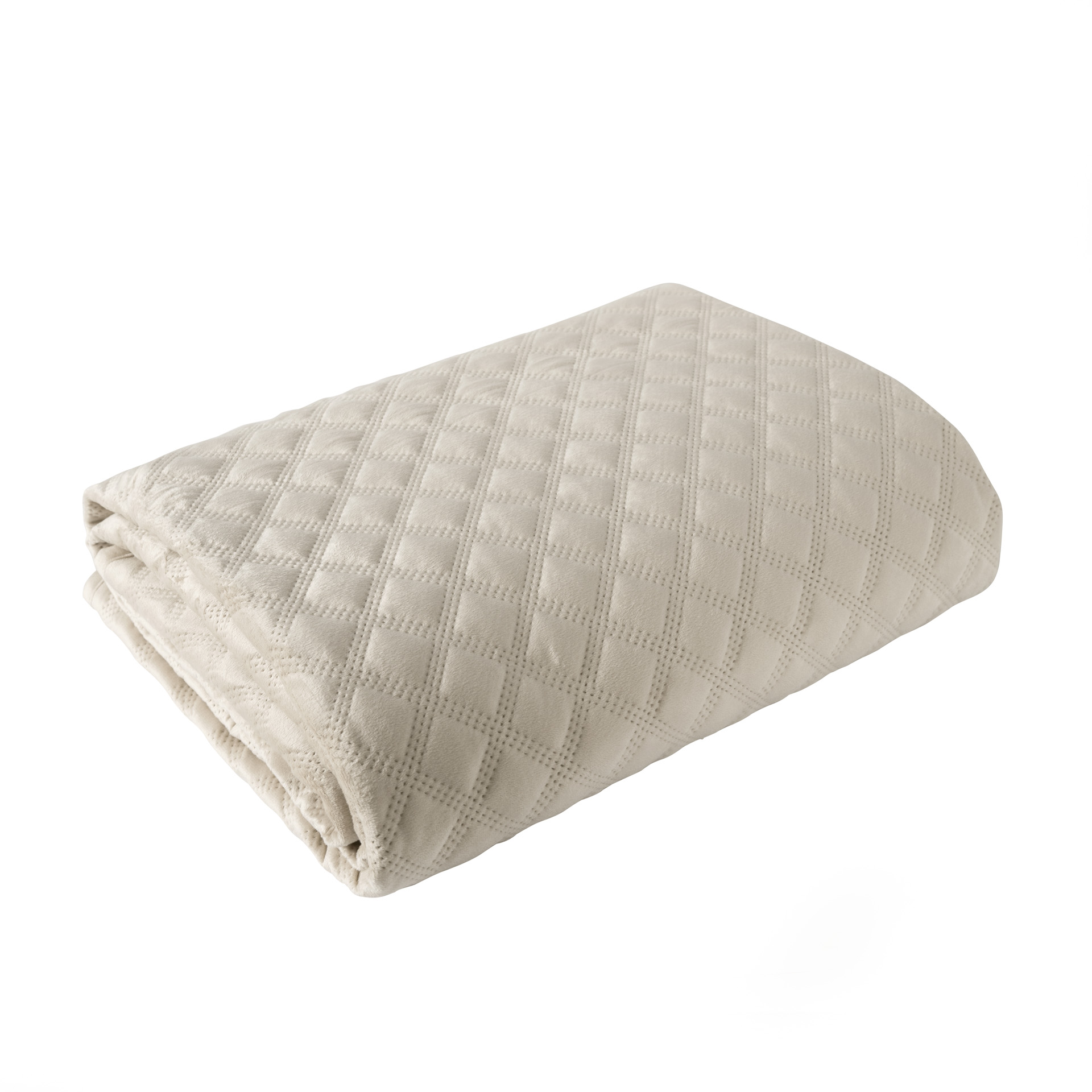 Dekoratiivne tepitud voodikate, geomeetrilise mustriga, valmistatud kuumpressimise tehnikas.